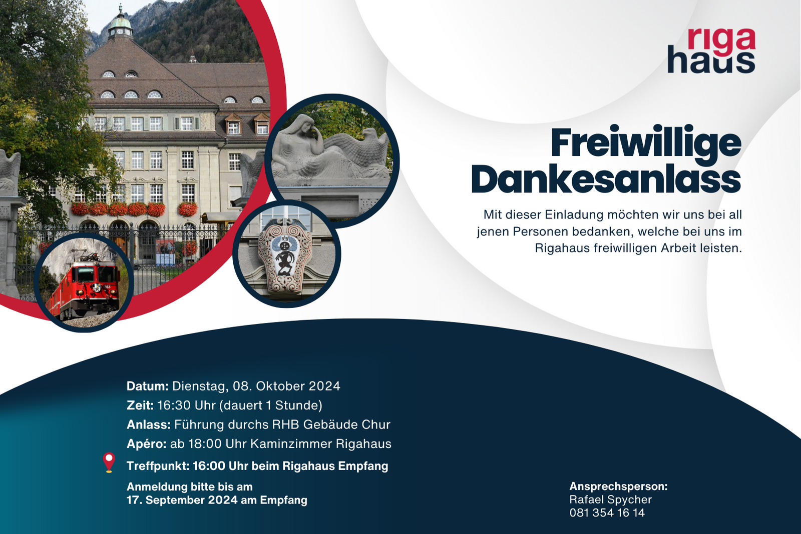 Am Dienstag 8. Oktober, fand ein besonderer Tag für unsere engagierten Freiwilligen statt, die das Rigahaus durch ihren unermüdlichen Einsatz tatkräftig unterstützen. Trotz des regnerischen Wetters liessen sie sich nicht davon abhalten, an unserem geführten Ausflug zum historischen RHB-Gebäude in Chur teilzunehmen.